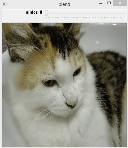 Now that we have covered the basics, we will check a slightly more complex example where we will add a slider to the OpenCV window, to be able to vary the weight of each image to the final result. For a detailed explanation on how to add a slider to a window, please check here.