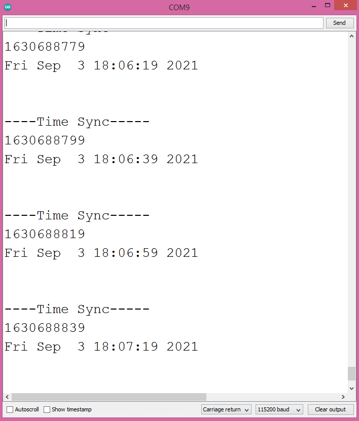 This function takes no arguments and returns as output the sync interval, in milliseconds. This value is returned as a uint32_t, meaning we can directly print it to the serial port, like shown below.