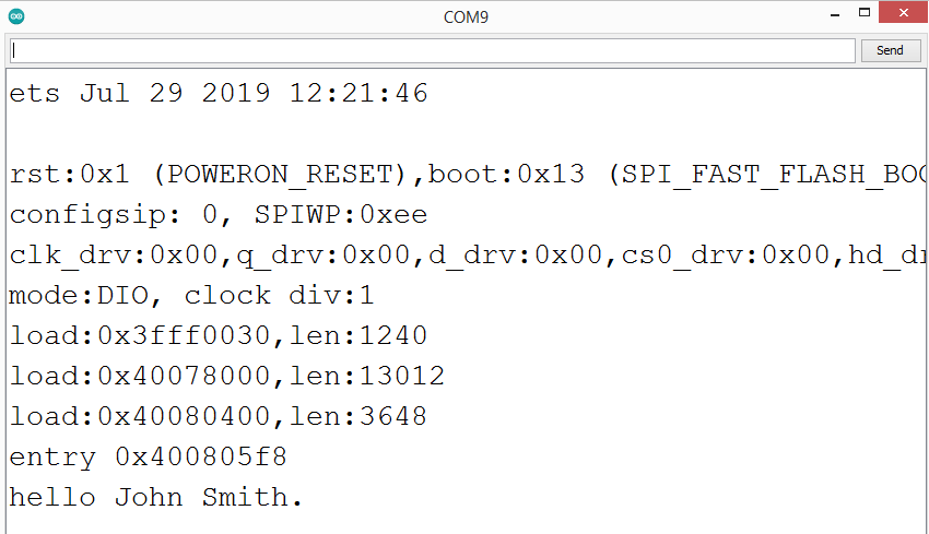 Finally, we will print the result to the serial port. Since we obtain a std::string as output of the render function and the println Serial method doesn’t support these strings, we need to call the c_str method before printing the result.