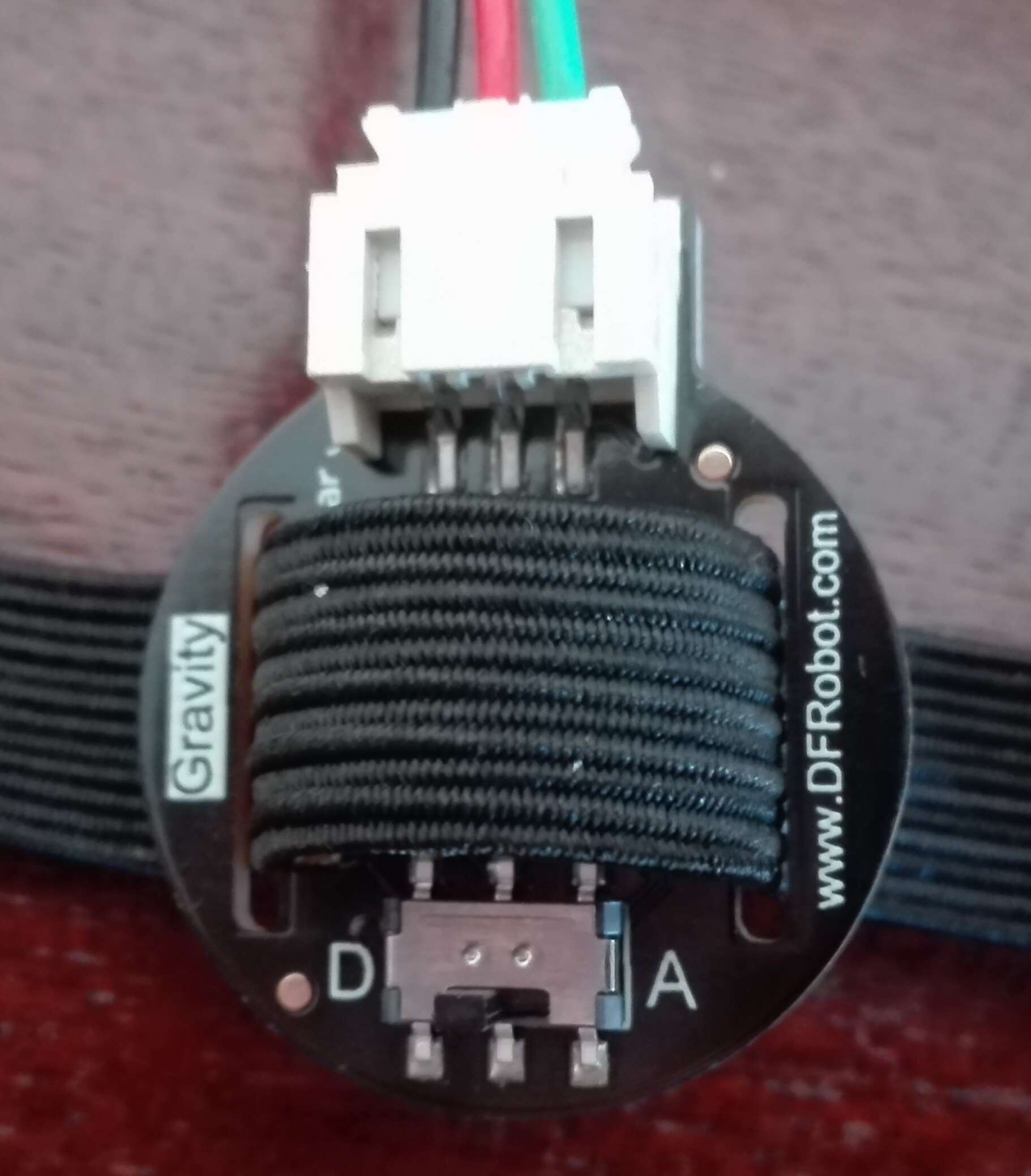 Figure 2 illustrates the top of the module. We can can clearly see the terminal for the 3 wires, which is easy to attach and detach. We can also see a switch that allows to change the sensor to operate in digital or analog mode. Note also how the band is wrapped around the sensor, to facilitate stabilizing it. Nonetheless, the band can easily be adjusted or removed.