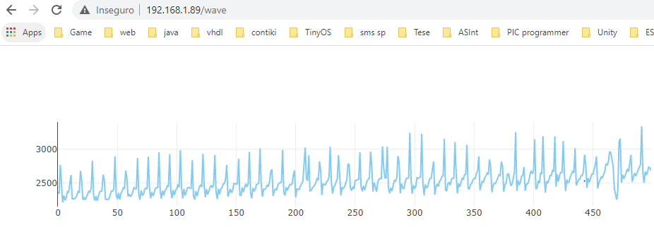 Note that we did not specify any x axis values in the HTML page. Consequently, the chart will represent 1 unit in the x axis per each measurement in the array (recall that it has a length of 500). It is also important to mention that the more stable the sensor is, the cleaner the wave will be.